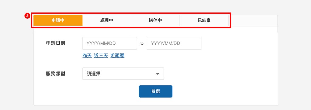 步驟 2:請選擇「申請中」、「處理中」、「送件中」或「已結案」案件狀態