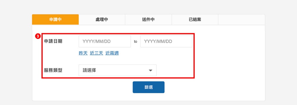步驟 3:請點選「申請日期」和「服務類型」